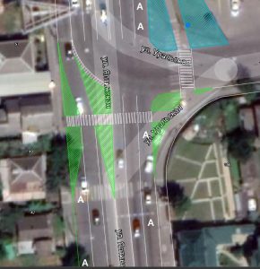 Сейчас там есть пространство обозначенное разметкой, как островок безопасности. Мы предлагаем перенести край проезжей части, сделав его по этой линии разметки. Таким образом пространство которое сейчас пропадает зря дополнит тротуар и зону озеленения.